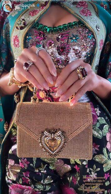 nos confirmó que los accesorios son parte fundamental para tener el look más chic, pues los accesorios dorados con toques rojo en pendientes, pulseras y anillos se hicieron presentes, combinado tacones y bolso del mismo color, haciendo el match perfecto con su look.