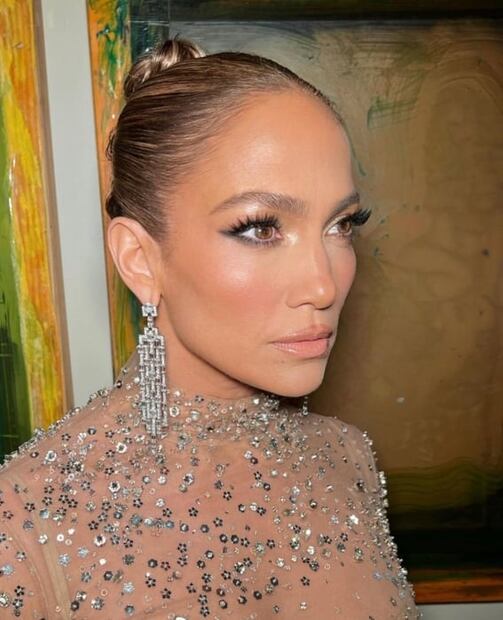 El beauty look de Jennifer Lopez se centró en potenciar el brillo del vestido . En los ojos llevó un sutil difuminado con iluminador, un delineado cat eye y pestañas con efecto de volumen. Usó blush rosa claro para acentuar los pómulos y en los labios llevó un color nude con un toque de brillo. El pelo lo lució completamente recogido en un chongo alto con la frente descubierta.