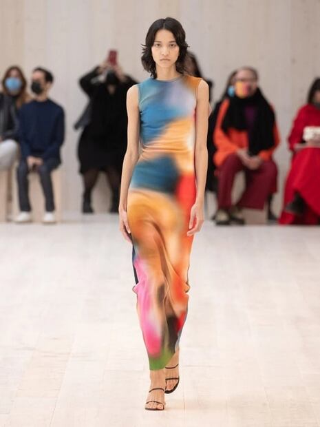 Si bien las sandalias thong se robaron la atención de los cazadores de tendencias , no es posible ignorar el vestido largo que lucía la modelo por su hermoso colorido. Se trata de una pieza multicolor de la colección Primavera/Verano 2022 de Loewe, un diseño elaborado en algodón que es perfecto para el clima de la temporada, sin mangas y con cuello redondo.