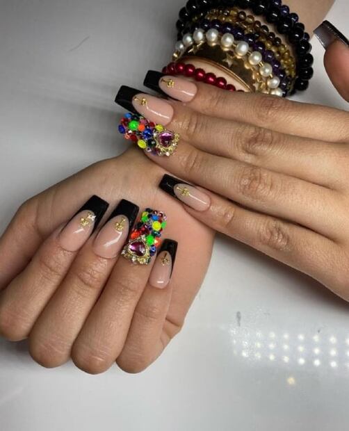 Como decoración final, las uñas de Ángela Aguilar adquirieron un efecto 3D gracias a la pedrería colocada cuidadosamente en el dedo anular de cada mano. En la parte inferior, una piedra de corazón rosa con bordes dorados sobre los que destacaban pequeños brillos, se centró como elemento protagonista; mientras que a lo largo, fueron pegadas aplicaciones de diversos colores y tamaños que llenaron la uña en su totalidad, dándole textura y un efecto 3D .
