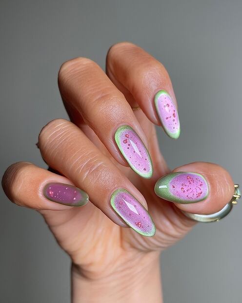 Este diseño de uñas sofisticado está inspirado en el interior de la guayaba. Tiene un borde verde y el centro rosa con semillas blanquecinas. Su creadora, San Sung Kim, utilizó esmaltes para aportar el famoso efecto cat eye.