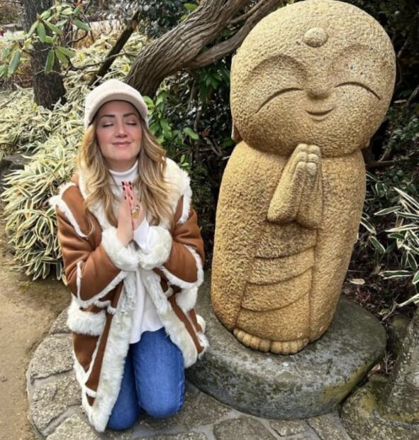 Uno de los looks más impresionantes de Andrea ha sido el que lució en el templo de Kotokuin, donde la conductora combatió al frío japonés portando un abrigo adornado con peluche en los contornos de las costuras y en las mangas.