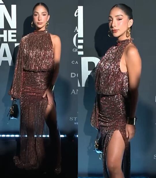 El vestido de María Chacón, diseñado en un tono marrón cobrizo con destellos metálicos, capturó la esencia de glamour del evento. De corte asimétrico, la prenda deja un hombro al descubierto, mientras que una manga larga con caída fluida agrega movimiento y sofisticación.