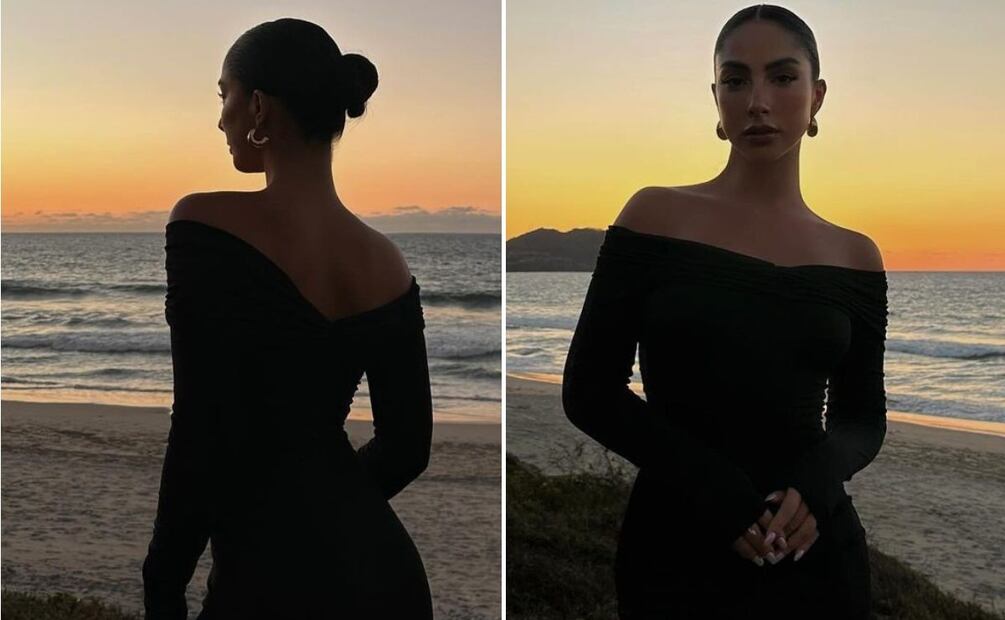 Con el mar de fondo, la actriz de Cabo posa con un vestido largo de color negro. La prenda se ciñe a la silueta y es de mangas largas, característica que acentúa la elegancia del clásico tono al instante. Pero, el aspecto que más resalta es el diseño del escote que deja sus hombros desnudos.
