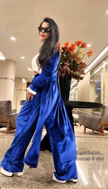 El look para ir a cenar de Martha Debayle consistió en un pantalón y cardigan de terciopelo en color azul , muy de acuerdo a la moda inspirada en los 2000, cuando las telas con textura suave estuvieron más en tendencia que nunca.
