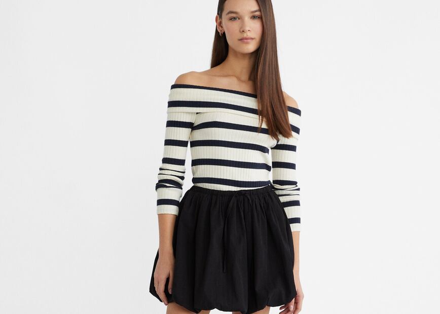 Las faldas y vestidos con corte evasé están ceñidos en la cintura y se amplían en la falda, tienen la conocida forma de "A" que hace que la cintura luzca más estrecha. Su diseño suele favorecer a la mayoría de los tipos de cuerpo. Se sugiere que la camisa o blusa esté por dentro de la falda para definir la cintura; también se puede llevar con top entallado o crop top, según tu estilo y como te sientas cómoda.