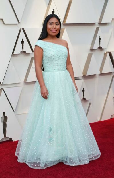 se ha convertido en una de las actrices más destacadas del cine mexicano actual. Sin embargo, para su paso por la alfombra roja de la 91ª edición de los premios Oscar la actriz oaxaqueña asistió con un vestido color menta de la firma Rodarte primavera verano 2019 . La actriz oaxaqueña asistió acompañada por sus familiares y su compañera Marina de Tavira, la cual asistió con un vestido rojo de holanes en tul de la marca J. Mendel