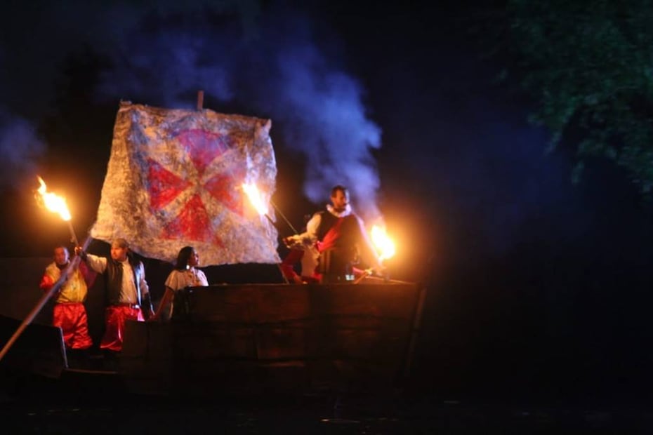 En el Embarcadero de Cuemanco parten las trajineras hacia un canal iluminado con antorchas que conduce a la laguna. Los espectadores observan la obra desde su trajinera.