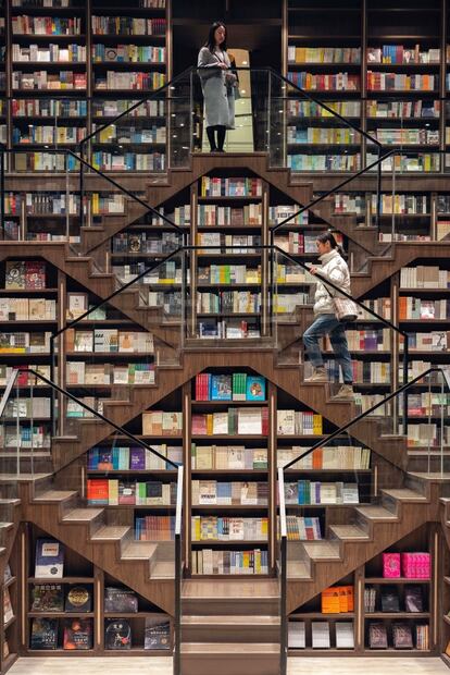“Este espacio permite a los visitantes descansar en los escalones de la estantería y sumergirse en los libros y sus pensamientos”, dice Li Xiang, diseñadora creativa del proyecto.