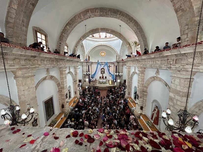La lluvia de pétalos se realiza en la Parroquia de la Purísima Concepción, en pleno centro del pueblo mágico de Mineral del Chico, Hidalgo.