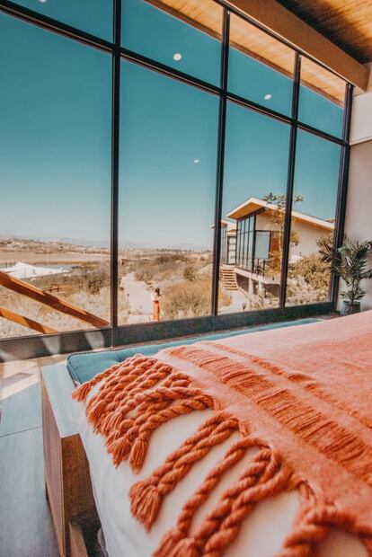 En pleno Valle de Guadalupe , en la Ruta del Vino y a 40 minutos de Ensenada, fueron instaladas las 12 cabañas de lujo de este hotel boutique que parecen mimetizarse con el entorno. A estas se llega por medio de puentes de madera, un campo de salvia blanca (planta con propiedades curativas y aromáticas) y un viñedo.