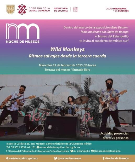 Si lo tuyo son más las actividades manuales o simplemente quieres disfrutar de una noche con agradable música, no vas a querer perderte el programa del Museo del Estanquillo que contará con talleres para colorear tu propia máscara de luchador, mientras se presenta un concierto en vivo de música surf por parte de los Wild Monkeys .