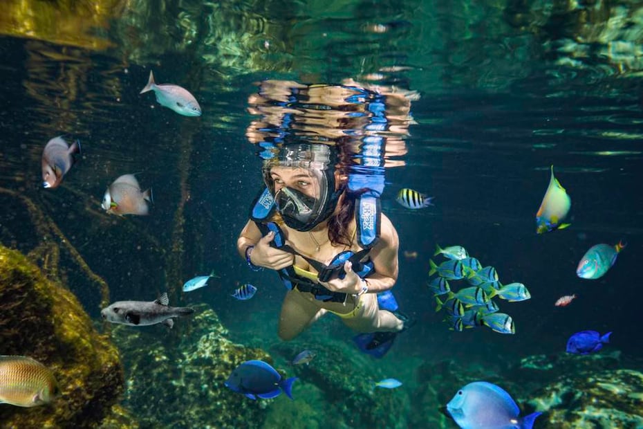 El esnórquel es una de las actividades estelares en Xel-Há. Pero hay una modalidad que también llama la atención: sin dejar el esnórquel, tomas un pequeño jet (totalmente silencioso) que diriges con tus manos (una especie de propulsor), que te hará moverte con total facilidad y sin esfuerzo de bajo del agua.
