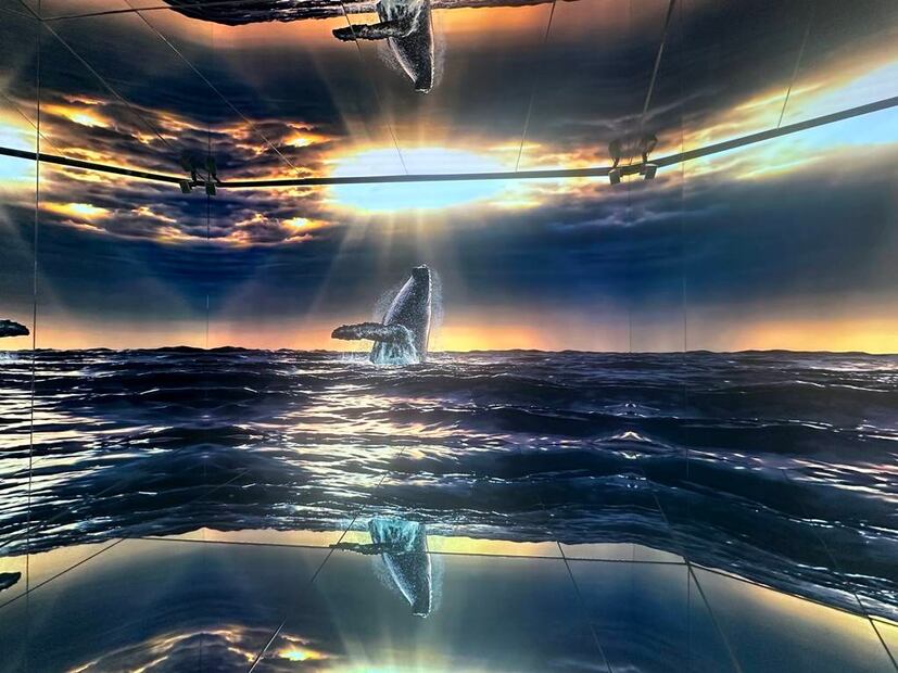 Por fuera, la imagen de una golondrina ‘partida’ en varios cuadros de acrílico. Por dentro, un cuarto donde 3 de sus paredes se ‘inundan’ con proyecciones que asemejan imponentes cascadas.