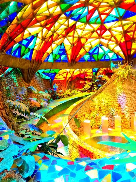 El techo está conformado por un vitral de formas geométricas en colores brillantes como azul, amarillo, rojo y verde, rodeados por piedras que juegan con las líneas y las formas.