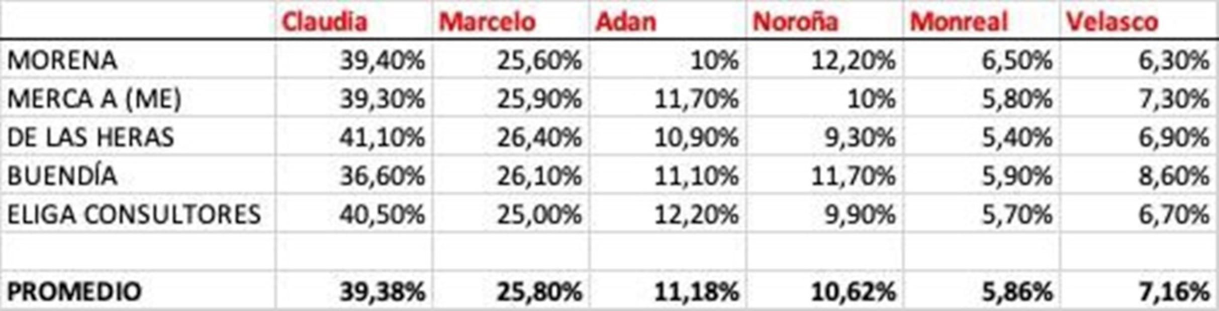 Con 10 puntos de diferencia de Marcelo Ebrard, la exjefa de gobierno obtiene la ventaja para encabezar el movimiento de la Cuarta Transformación. El tercer lugar se debate entre Adán Augusto López y el diputado con licencia Gerardo Fernández Noroña, mientras que Manuel Velasco queda en quinto lugar y Ricardo Monreal en sexto, de acuerdo con la encuesta general del partido.