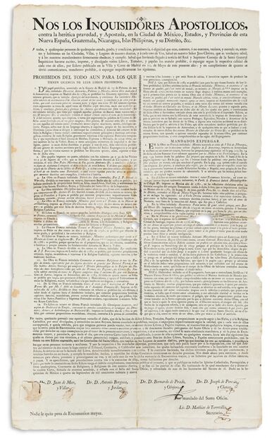 The document on “Inquisition that Forbids Several Books from the French Enlightenment” was classified in lot 318 and was sold for USD $2,000. Its description mentions that it included three pages signed by Juan Mier y Villa “and three other inquisitors with manuscript signatures,” from September 4, 1789.