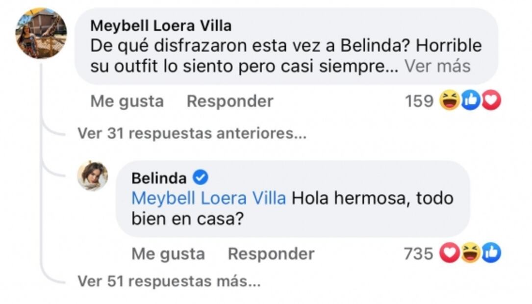 “¿De qué disfrazaron esta vez a Belinda?”, a lo que la cantante respondió: “Hola Hermosa, ¿todo bien en casa?”, generando risas entre los usuarios de la red social.