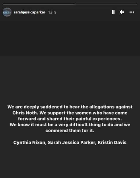 Las estrellas de la serie Sarah Jessica Parker, Cynthia Nixon y Kristin Davis emitieron un comunicado conjunto el lunes en redes sociales diciendo que estaban tristes por las acusaciones contra Noth, pero que respaldaban a sus acusadoras.