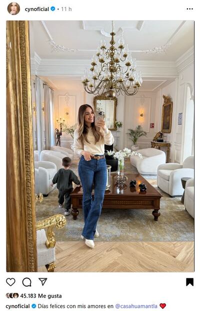 A un mes de que León cumpla dos años, Cynthia Rodríguez desató suspiros al compartir una foto desde Casa Huamantla, en Huamantla, Tlaxcala, tierra natal de su esposo Carlos Rivera, en dicha instantánea, la conductora aparece frente a un espejo junto a su hijo, quien luce de pie y de espaldas.