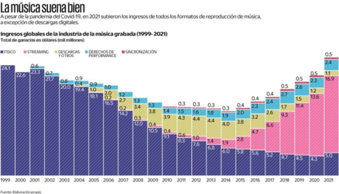 Por primera vez en 20 años, en 2021 hubo un crecimiento a nivel global en los ingresos del mercado físico de 100% de ganancias de la, representó 19.2%, pero su aumento respecto al año anterior fue de 16.1% en forma general, según cifras del IFPI (Federación Internacional de la Industria Fonográfica).