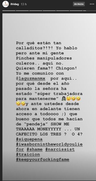 En otra de sus publicaciones, Frida expresa que estaría dispuesta a sentarse a hablar con la intérprete y con sus "mantenidos" que a su vez son sus exnovios, y da nombres de los involucrados.