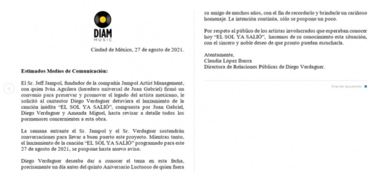 “…No se va a estrenar, la razón es muy sencilla y se los quería decir yo personalmente, la gente que representa los derechos, el legado del maestro Juan Gabriel, me pidió especialmente el director de la empresa Jeff, que pospusiera el lanzamiento porque teníamos todavía que resolver un par de detalles y lo vamos a hacer, entonces la semana que viene lo resolvemos y muy pronto yo les anuncio la nueva fecha de lanzamiento de esta hermosa canción”, comentó Verdaguer por medio de un video en sus redes sociales.