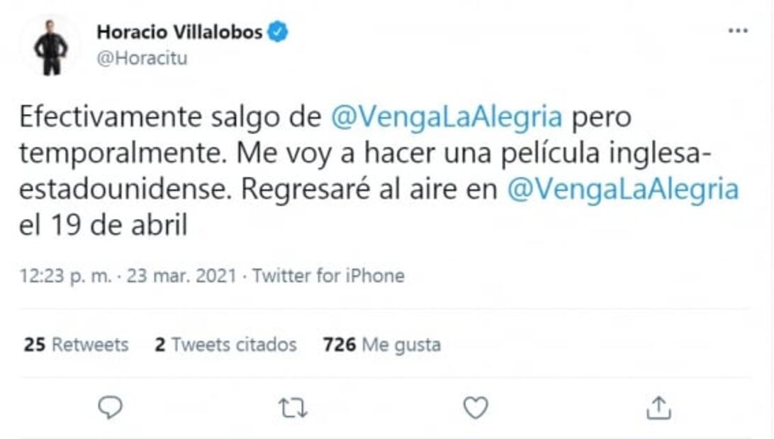 "Efectivamente salgo de@VengaLaAlegria pero temporalmente. Me voy a hacer una película inglesa- estadounidense. Regresaré al aire en @VengaLaAlegria el 19 de abril", se lee.
