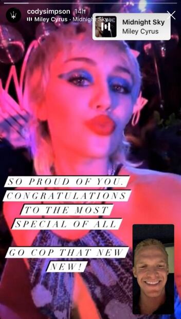 A pesar de las diferentes versiones de Miley y Cody, el cantante y compositor expresó el orgullo que sentía por Cyrus y publicó una foto de ella en sus stories de Instagram en donde agregó: "Estoy muy orgulloso de ti. Enhorabuena a la persona más especial de todas".