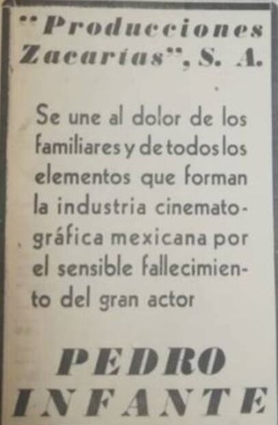 “Adiós al máximo intérprete de la canción mexicana”, se lee en una de las esquelas que se publicaron el 16 de abril en EL UNIVERSAL, producciones Zacarías se despidió del que consideraron gran acto, mientras que la fábrica de discos Peerless le dijo adiós al fiel intérprete de la canción mexicana.
