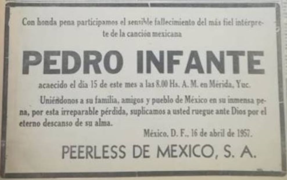 “Adiós al máximo intérprete de la canción mexicana”, se lee en una de las esquelas que se publicaron el 16 de abril en EL UNIVERSAL, producciones Zacarías se despidió del que consideraron gran acto, mientras que la fábrica de discos Peerless le dijo adiós al fiel intérprete de la canción mexicana.