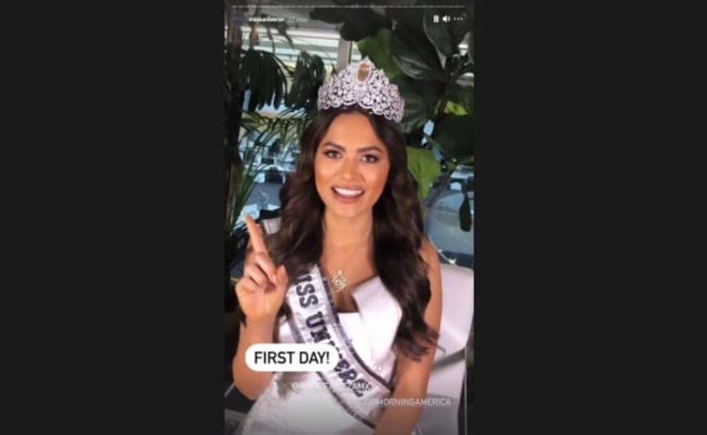 "Soy Miss Universo y hoy es el primer día de trabajo. Estoy a punto de iniciar una entrevista con Good Morning America", fue lo que contó Andrea Meza esta mañana en la cuenta de Instagram de Miss Universo, refiriéndose a la primera jornada de su reinado.