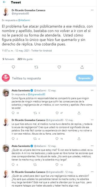 “Muchos me expresan las pocas ganas que sienten de atenderme si fuera su paciente porque escribí sobre su compañero. Yo misma me negaría a poner lo más sagrado de mi vida, mi salud, en manos de alguien que se mueve desde la entraña por algo que no le corresponde, por envolverse en la bandera de una profesión poniéndola por encima de un paciente. Yo también puedo recurrir a las instituciones correspondientes para denunciar amenazas, acoso y violencia contra mí”.