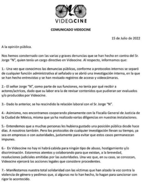 Hoy, Videocine informó que "conforme a protocolos internos se separó de cualquier función administrativa al señalado y se abrió una investigación interna, en la que se han hecho entrevistas y se han revisado registros de acceso y videocámaras" de "Coco" Levy.