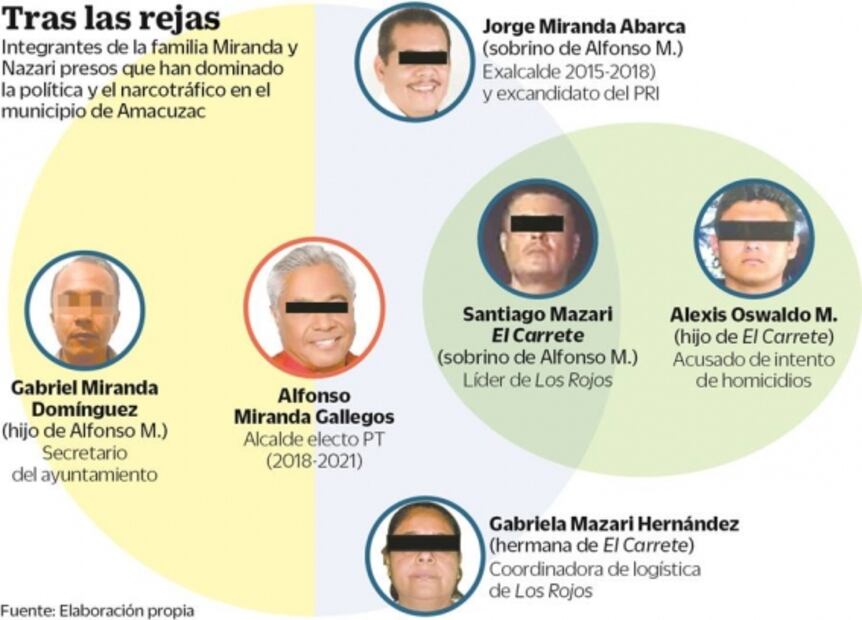 De la familia Miranda también están presos Gabriel —hijo del alcalde electo Alfonso Miranda y actual secretario del ayuntamiento— y Oswaldo Mazari —hijo de El Carrete—, procesados por el delito de intento de homicidio en agravio del exedil de Amacuzac, Noé Reynoso Nava (PVEM), (2012-2015).