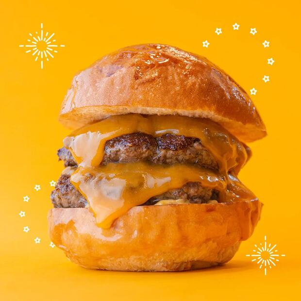 Son 400 gramos de carne wagyu jugosa (dale oportunidad al término medio), queso cheddar, pepinillos y pan brioche hecho en casa. Se acompaña de papas a la francesa o chips.
