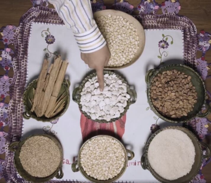 La cocinera encargada de la bebida ceremonial que se llama chocolate atole, tuesta en un comal a fuego bajo sin encalar, primero el arroz, luego el maíz, después el trigo, siguiendo con el cacao sin quemarlo, después se quita el fuego del comal y se calienta el pataxte y al final la canela, una vez tostados, se muele y se reserva para el día de la mayordomía.