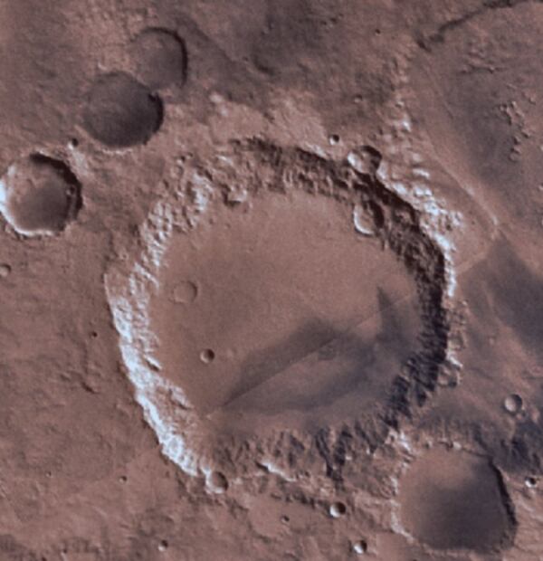 El planeta vecino es hogar de , un cráter de más de 100 kilómetros de diámetro que se ubica en la región del cuadrángulo Sinus Margaritifer, al sur de Meridiani Planum.