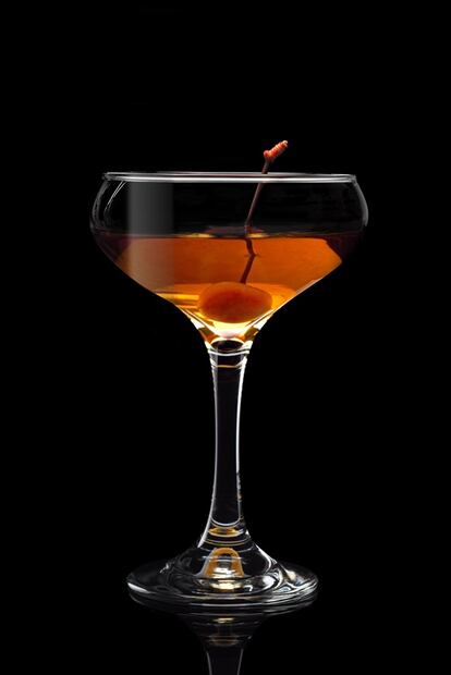 Llena la mitad de un shaker con cubos de hielo y todos los ingredientes. Agita durante 10 segundos. Frota la cáscara de naranja alrededor del borde de una copa fría y cuela el líquido en el vaso. Añade una cereza negra para adornar.