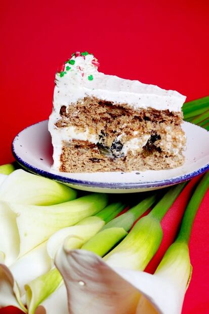 Entre cada capa de pan, está relleno de compota de chile poblano, porque sí, el chile puede ser una gran adición a un pastel si sabe integrarlo. Va cubierto con betún de nogada , hecho con queso crema y nuez; y decorado con la tradicional granada y grageas verdes de azúcar, para asemejar el perejil.