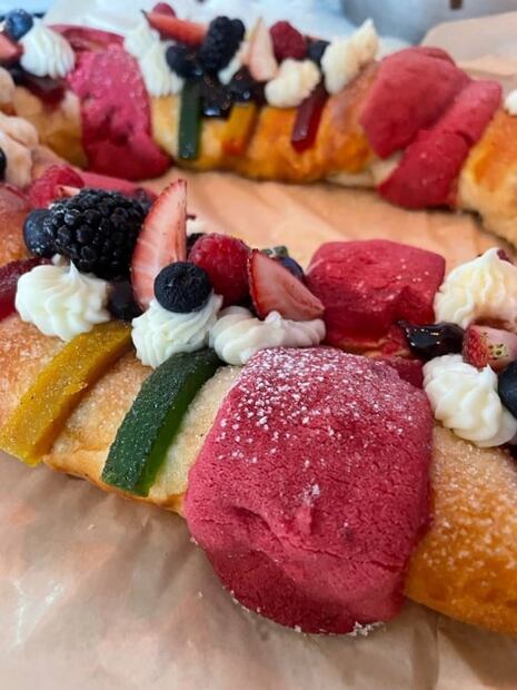 Con la clásica tapa de azúcar y cerezas marasquino, Kenny Kuri y su equipo nos esperan con roscas de reyes recién horneadas todos los días, de hoy al seis de enero. Hay tres tamaños: individual, mediana y grande.