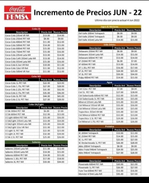 En el caso de , Coca Cola anunció que el aumento de precios se verá reflejado en sus siguientes productos : Coca Cola, refrescos de sabores (Sprite, Fresca, Fanta, Sidral mundet, etc), jugos Del Valle, Powerade, agua Ciel, Topochico, Fuze Tea, Ades, Monster, entre otros.