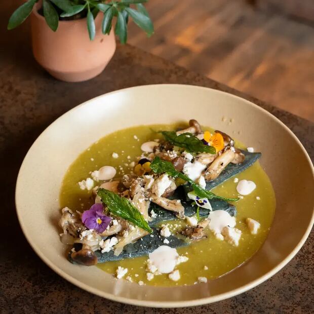 Los tacos de hongos de la montaña con hierba santa, quesillo, miltomate y guacachile y el caldo amarillo con hongo ji'i vaya y caldo de gallina son dos creaciones en las que Thalia Barros echa mano de los hongos de temporada.