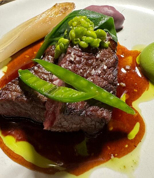 Como tercer tiempo, llegó un Wagyu al sartén con una reducción de sus jugos, poros asados, endivia a la naranja y cúrcuma, emulsión de shiso (una hierba asiática), limón y chícharos tiernos. Este se maridó con Sake Nami ginjo. Como postre, aceite de olivas, pepino, aceituna y calpis y un Saki Nami junmai.