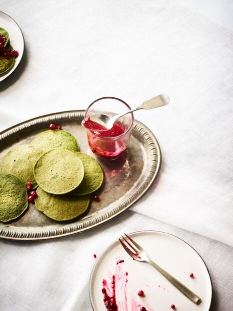 1. HOTCAKES DE ESPINACA Y MERMELADA DE ARÁNDANO ROJO