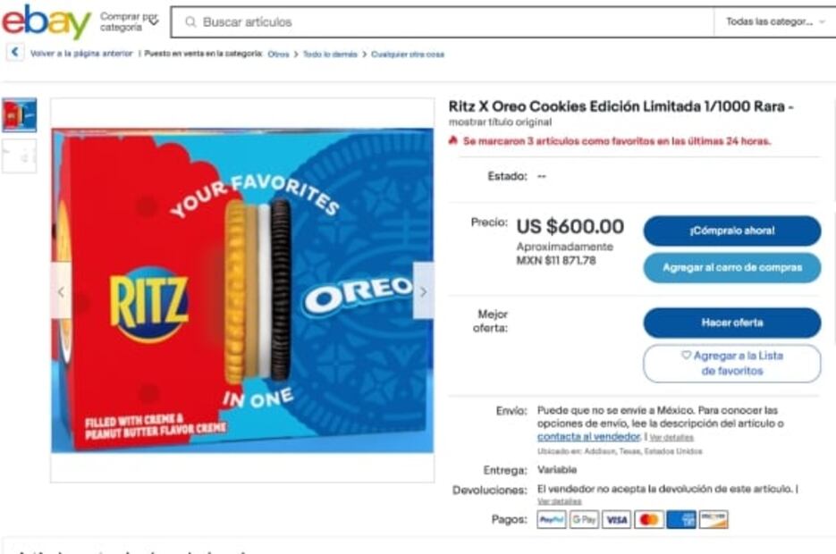 El estremecedor recibimiento y altas expectativas de la Oreo x Ritz motivó a que ciertas personas se pasaran de vivas y consiguieran la edición súper limitada, para revenderlas en sitios como Ebay, donde una sola caja ronda los 600 dólares, algo así como 11 mil pesos mexicanos. Así, las galletas que no llevan ni un día de existencia y ya son todo un santo grial de la comida comercial.