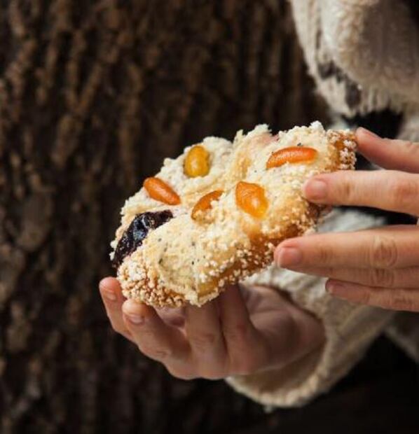 de la chef Elena Reygadas , preparó una linda y suculenta mini rosca con mazapán , cáscara de naranja e higos confitados, disponible en todas sus sucursales. También la puedes encontrar en Café Nin .