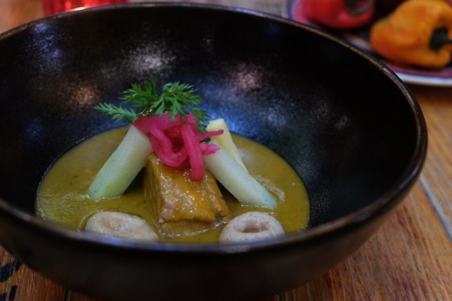 De segundo plato, le siguió el coloradito. Un medallón de guajolote bañado en una salsa untuosa y de tonalidad ladrillosa, una cara de la tradición de moles en donde el picor de toda la vida se desenvuelve con jovialidad. Muestra un balance entre la acidez y el dulzor digna de napar con tortillas hasta dejar el plato vacío.
