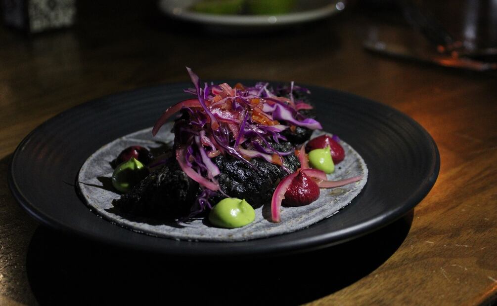 Recomendación: El taco negro: lenguado en tortilla de maíz azul, acompañado de ensalada de col morada con crema, aguacate y mayonesa de betabel.