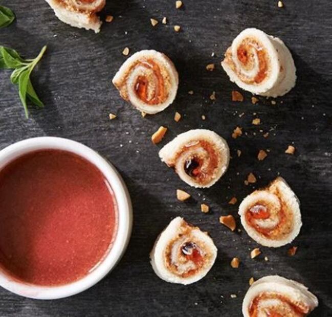 Rollos de mantequilla de cacahuate y mermelada con salsa de bayas
